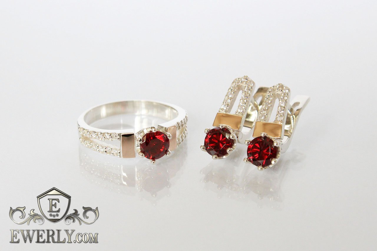 Женские серебряные серьги и кольцо с золотом и камнями - фианитами цвета-гранат.