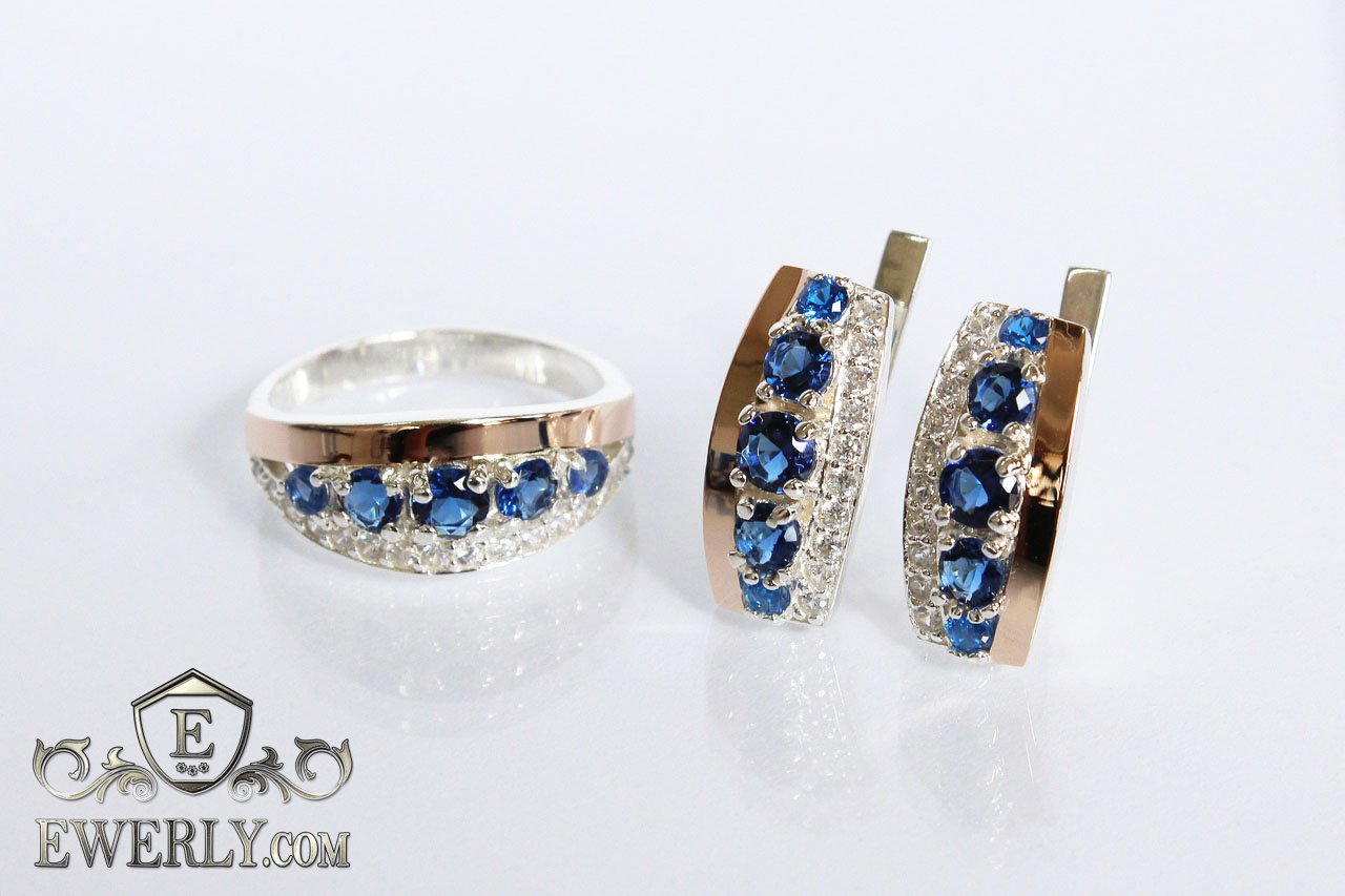 Кольцо и серёжки из серебра с золотыми пластинами и камнями - синими фианитами для девушек.