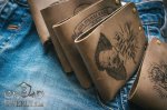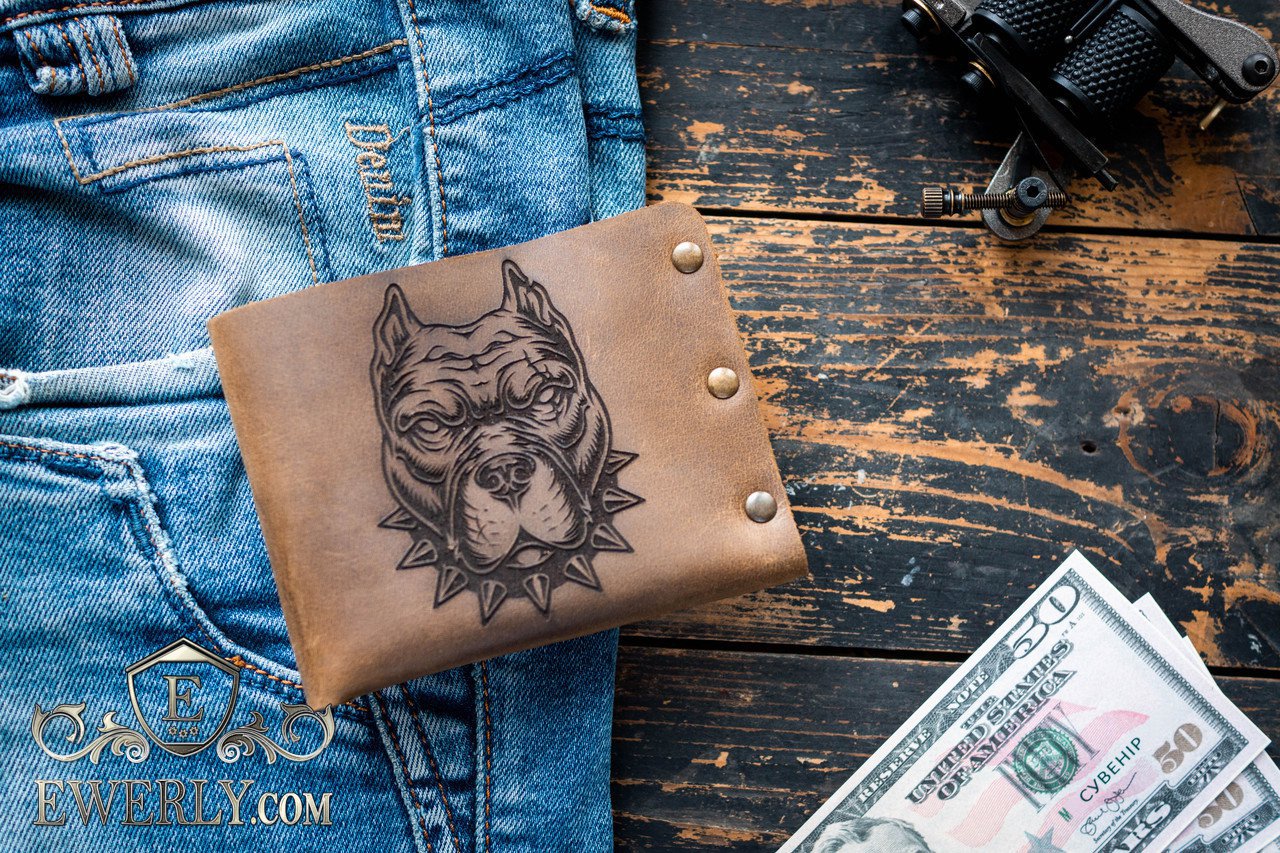 Полностью выполнен из натуральной кожи и металлических заклепок. Эксклюзивное реально мужское портмоне ручной работы с изображением питбуля, имеет эффект потёртости и лёгкой небрежности. Рисунок нанесён на кожу с помощью лазера (лазерная гравировка). Изготовлен в ограниченном выпуске.
