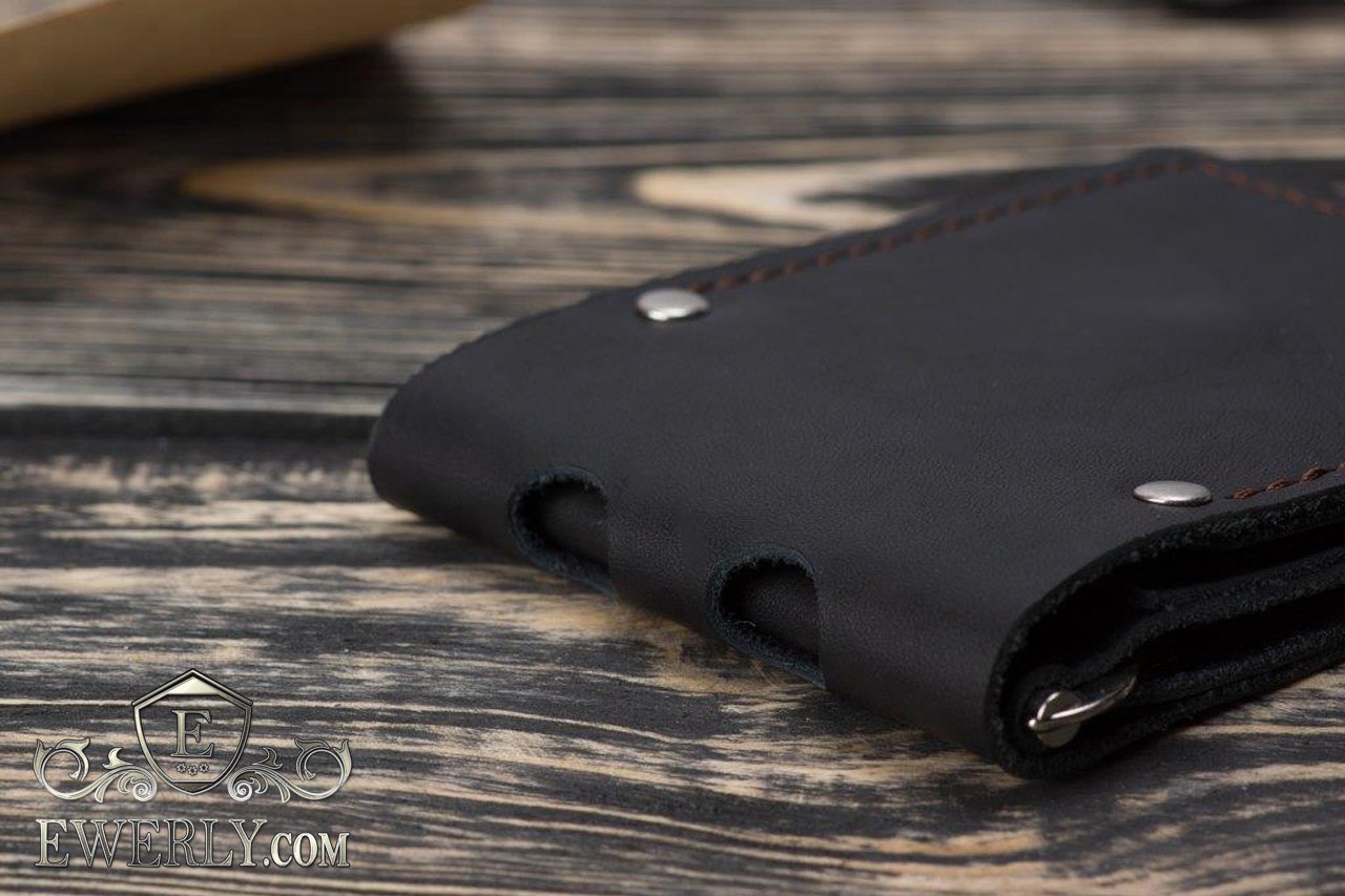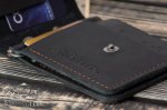 Зажим выполнен из натуральной кожи и является полностью ручной работой. Состоит из двух отделений, две стороны одного из которых изнутри скреплены кнопками. Вмещает в себя бумажные деньги всех номиналов.