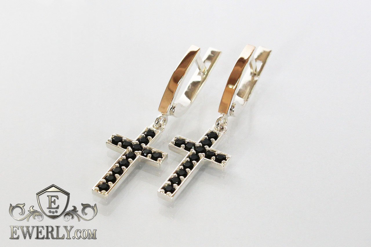 Женские серебряные серёжки - кресты из серебра 925 пробы с седцем и с золотыми вставками 375 пробы, камни чёрного цвета.