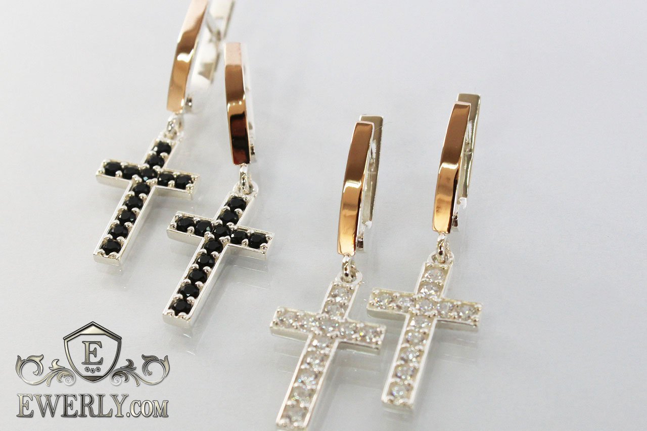 Женские серебряные серьги - кресты из серебра 925 пробы с седцем и с золотыми вставками 375 пробы, камни белого цвета.